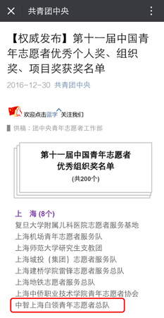中智上海白領青年志愿者總隊榮獲共青團中央授予的“中國青年志愿者優秀組織獎”