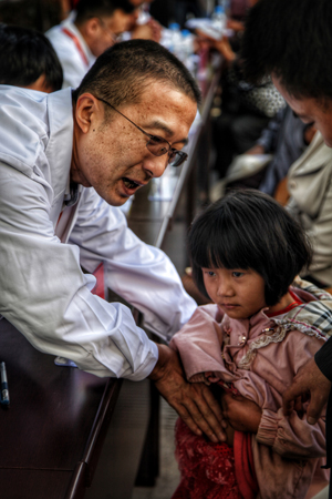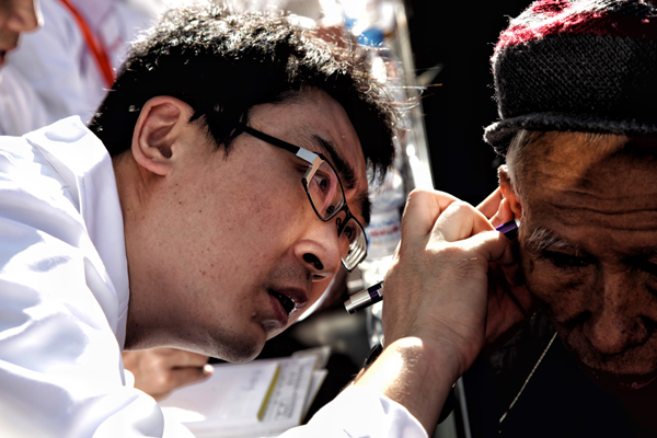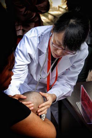 9月21日,受中智集團邀請而來的上海新華醫(yī)院的十幾位專家為當?shù)厝罕娺M行了為期一天的義診。本次新華醫(yī)院派出的專家都是各個科室的中堅力量,全部為副主任醫(yī)師以上職稱,科室也是根據(jù)當?shù)匦枨蠖_定的。義診現(xiàn)場,聞訊而來的當?shù)厝罕娫缭缇团牌鹆碎L隊。本次義診安排周密,有四個護士協(xié)助分診,有當?shù)蒯t(yī)生一對一協(xié)助,設置了的臨時檢查室等等。一天的義診,專家們共接待就診咨詢600余人次。第二天,專家們又進行了查房會診和工作交流。此外,另有專家為當?shù)蒯t(yī)務工作者進行了《醫(yī)院管理》、《院前急救》、《醫(yī)患溝通》、《乳腺外科檢查與診斷》等多場培訓。